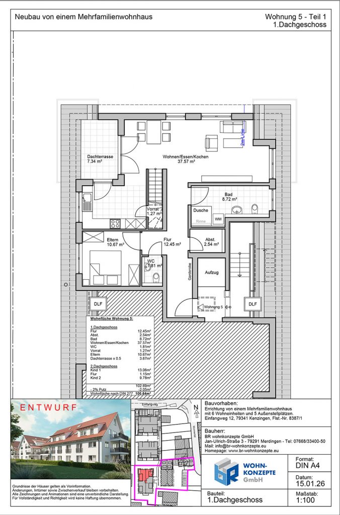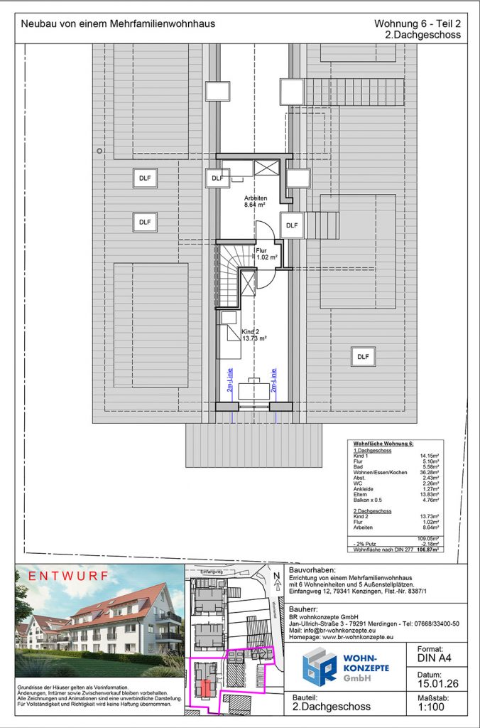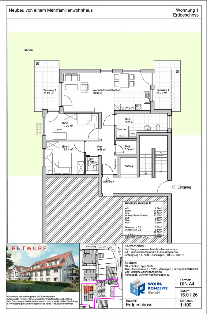 Derzeit entsteht im Einfangweg in Kenzingen ein Mehrfamilienhaus in zeitlos moderner Architektur. Das Gebäude umfasst sechs Wohneinheiten. Zu jeder Wohnung gehört eine Terrasse mit privatem Garten, ein Balkon oder eine Dachterrasse, wo Sie die warmen Tage genießen und sich Ihre persönliche Wohlfühloase schaffen können.