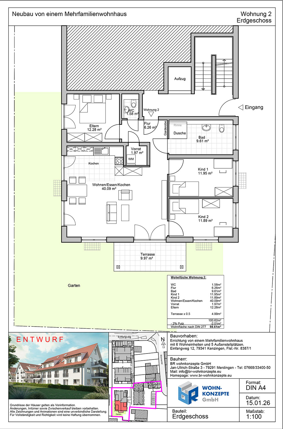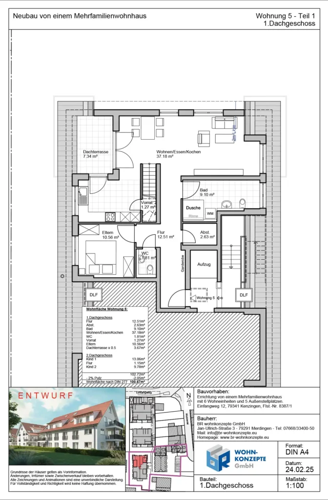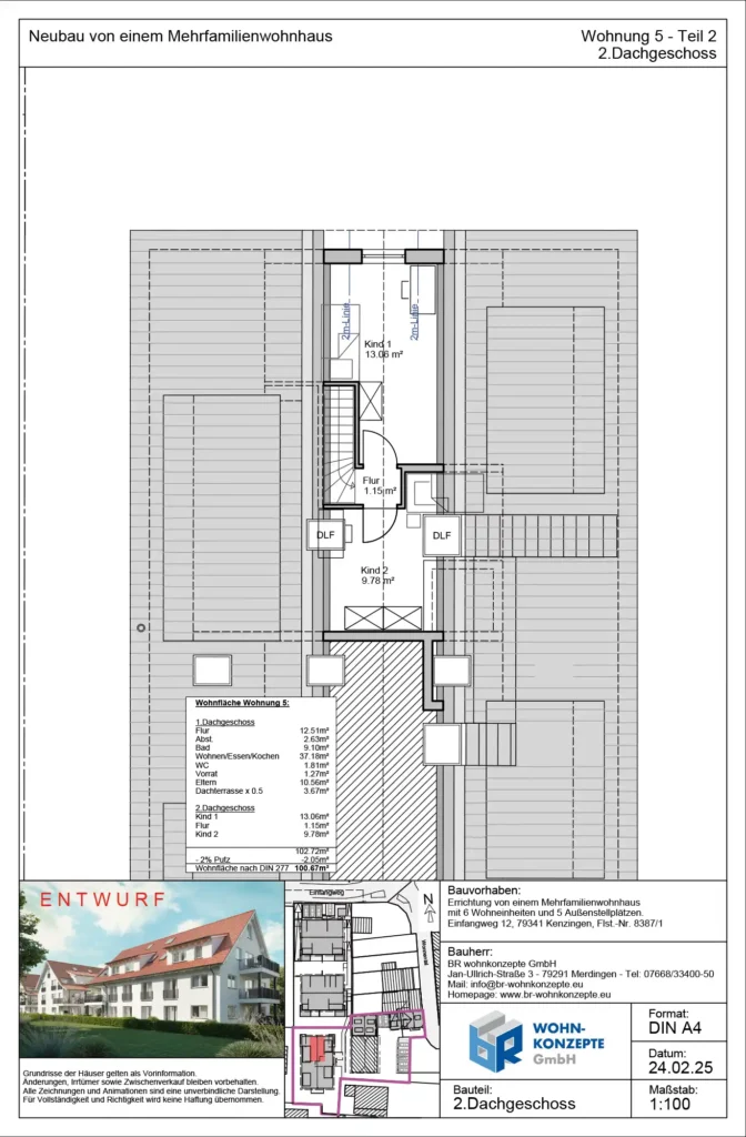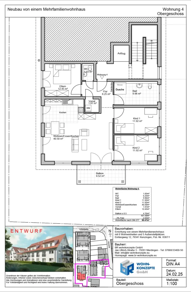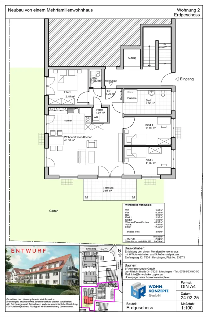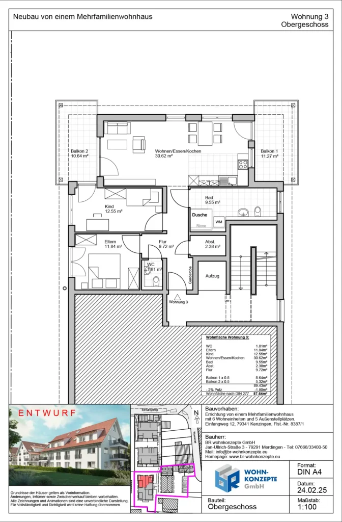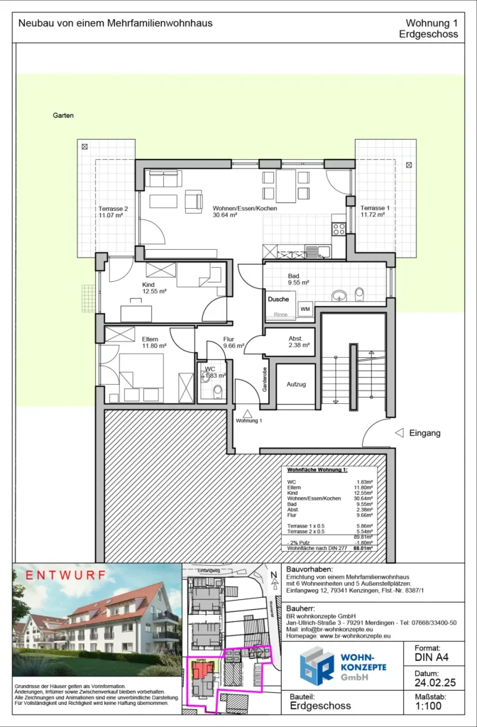 Derzeit entsteht im Einfangweg in Kenzingen ein Mehrfamilienhaus in zeitlos moderner Architektur. Das Gebäude umfasst sechs Wohneinheiten. Zu jeder Wohnung gehört eine Terrasse mit privatem Garten, ein Balkon oder eine Dachterrasse, wo Sie die warmen Tage genießen und sich Ihre persönliche Wohlfühloase schaffen können.